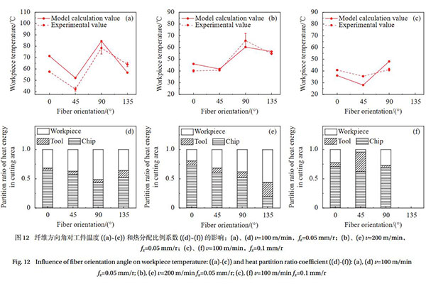 以T700碳纖維與聚醚醚酮(PEEK)復(fù)材制備而成的不同碳纖維角度板材的機(jī)加工數(shù)據(jù)為例,實驗結(jié)果顯示,在相同工藝條件下,纖維方向為90°和135°的板材傳入工件的熱分配比例系數(shù)和工件溫度明顯高于纖維方向為0°和45°的情況。另外,不論纖維方向如何變化,加工過程中傳入切屑和工件的熱分配比例始終大于傳入刀具的熱分配比例。切削速度和進(jìn)給量對工件溫度有顯著影響,通常情況下,隨著切削速度的增加,工件溫度會先上升后下降,在切削速度約為v=100 m/min時達(dá)到峰值。