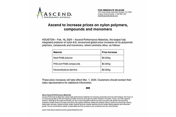 全球知名的大型一體化PA66產(chǎn)品系列生產(chǎn)商Ascend Performance Materials(奧升德)宣布,其聚酰胺聚合物、化合物和單體的全球價(jià)格全面上漲。價(jià)格將于2024年3月1日生效,消息中未提及漲價(jià)原因。