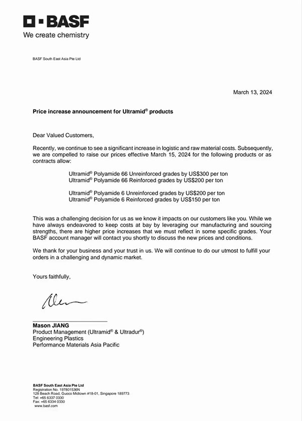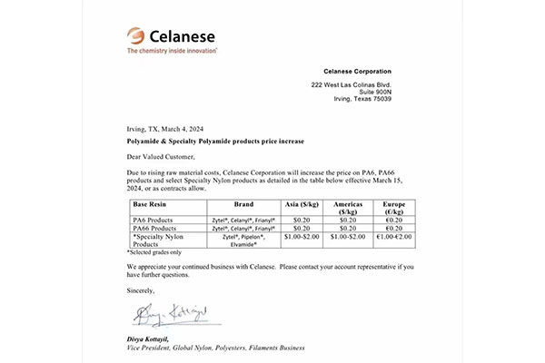 塞拉尼斯近日也發(fā)布漲價(jià)函,稱由于原材料上漲,將上調(diào)PA6、PA66產(chǎn)品和部分特種尼龍產(chǎn)品價(jià)格,自2024年3月15日起生效。