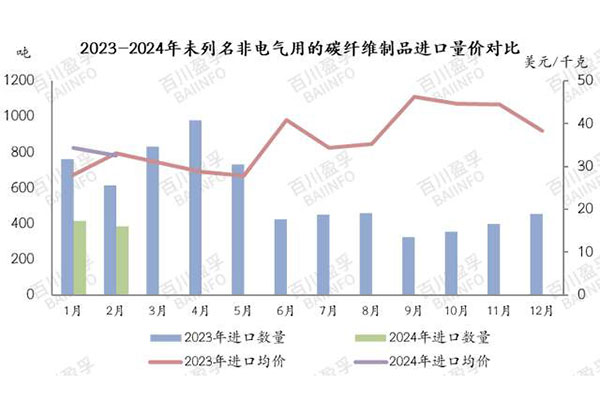 綜合來看,2024年1-2月國內(nèi)碳纖維市場價(jià)格區(qū)間窄幅波動(dòng),但下游需求偏淡,碳纖維產(chǎn)品進(jìn)口貨源同比減少,且主要以進(jìn)口碳纖維為主,其他產(chǎn)品進(jìn)口相對(duì)較少。