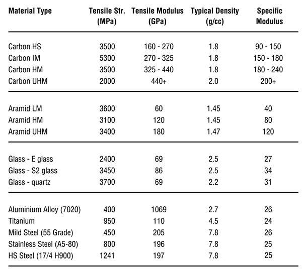 通過(guò)下表我們可以了解到最常用增強(qiáng)纖維的基本力學(xué)性能以及常見(jiàn)金屬材料的性能對(duì)比。