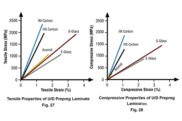 看上圖關(guān)于不同復(fù)合材料層壓板在失效時(shí)的強(qiáng)度和最大應(yīng)變,梯度越陡則性能越好,對(duì)比的有碳纖維、芳綸、玻璃纖維增強(qiáng)材料層壓板的拉伸性能以及壓縮性能,芳綸纖維在拉伸和壓縮性能表現(xiàn)上面有很大的不同,這在實(shí)際應(yīng)用中,就可以在拉伸性能需求的產(chǎn)品上應(yīng)用,但是在壓縮性能就表現(xiàn)平平,進(jìn)而要選擇玻璃纖維或者碳纖維增強(qiáng)的材料,整個(gè)的高性能還是碳纖維更優(yōu),這也是為什么碳纖維被稱為“黑色黃金”的一個(gè)關(guān)鍵原因。