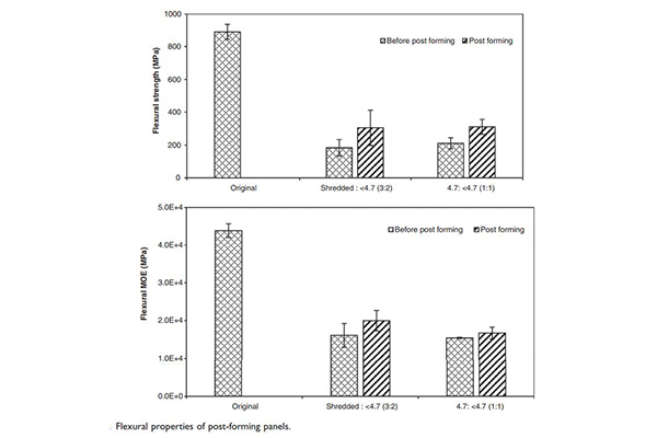 我們?cè)诳吹秸麄€(gè)的研究數(shù)據(jù)中,明顯能夠看到隨著顆粒尺寸減小,復(fù)合材料的力學(xué)性能得到提升,最優(yōu)的粉碎粒度條件為390°C和16分鐘。后續(xù)在對(duì)回收后的材料進(jìn)行應(yīng)用,制造出平面板材等后熱成型處理,通過(guò)這樣的方式,從而很好的完成該材料在應(yīng)用后再次回收應(yīng)用的閉合循環(huán)利用和實(shí)際零件或組件制造的可能性,證實(shí)了該回收過(guò)程及產(chǎn)品的巨大潛力。